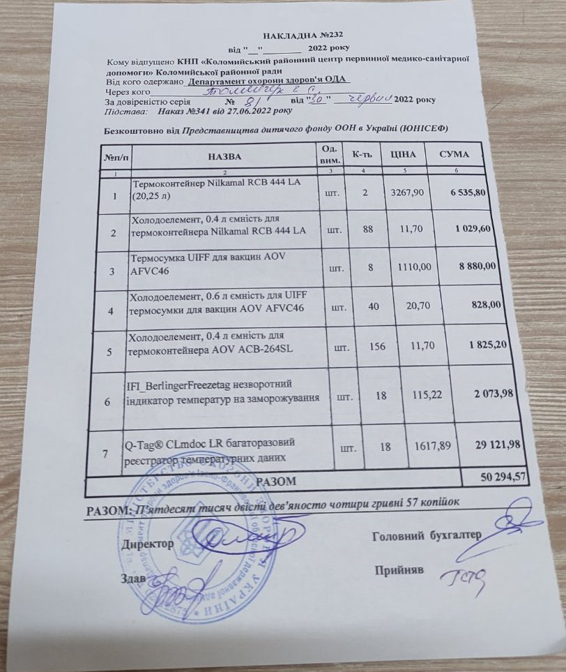 Адміністрація та колектив Комунального некомерційного підприємства “Коломийський районний центр первинної медико-санітарної допомоги Коломийської районної ради” дякує Департаменту охорони здоров’я Івано-Франківської ОДА за передані від Представництва дитячого фонду ООН в Україні (ЮНІСЕФ) в порядку благодійної допомоги термоконтейнери, холодові елементи, незворотні індикатори температур на розморожування та багаторазові реєстратори температурних даних.
